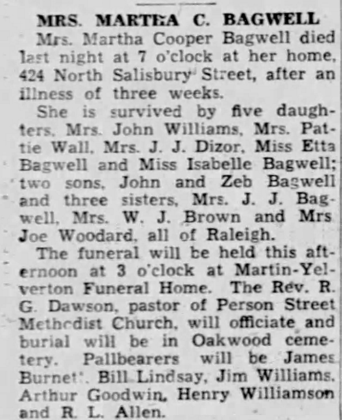 - [S392] Pattie Bagwell Wall, North Carolina Death Certificate: Pattie Bagwell Wall.