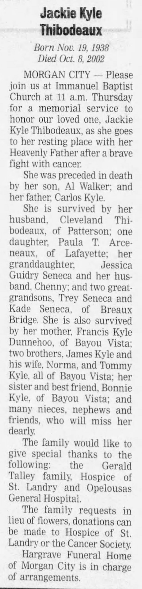 Jackie Kyle Bagwell was born on 19 November 1938 in Choctaw County, Mississippi. She was the daughter of Marzine Morris Bagwell and Frances Pauline Kyle. As of after 1955,her married name was Thibodeaux. Jackie Kyle Bagwell married Cleveland Thibodeaux after 1955. Jackie Kyle Bagwell died on 8 October 2002 at age 63. She was buried at Franklin Cemetery, Franklin, St. Mary Parish, Louisiana.