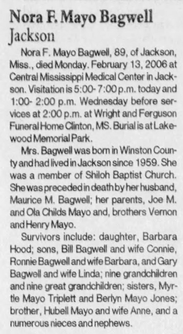 Nora Fay Mayo was born on 25 July 1917 in Winston County, Mississippi. As of before 1943,her married name was Bagwell. She married Marzine Morris Bagwell, son of William A. Bagwell and Edna Smith, before 1943. Nora Fay Mayo died on 13 February 2006 in Central Mississippi Medical Center, Jackson, Mississippi, at age 88. She was buried on 15 February 2006 at Lakewood Memorial Park, Jackson, Hinds County, Mississippi.