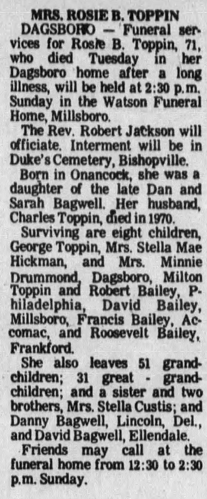 Rosie M. Bagwell was born circa 1906 in Onancock, Accomack County, Virginia. She was the daughter of Daniel W. Bagwell and Sara Ann Parker.1 Rosie M. Bagwell lived on 28 January 1920 in Lee, Accomack County, Virginia.1 As of before 1976,her married name was Toppin. She married (?) Toppin before 1976. Rosie M. Bagwell died on 4 April 1978 in Dagsboro, Accomack County, Virginia. She was buried at Dukes Family Graveyard, Bishopville, Worcester County, Maryland.