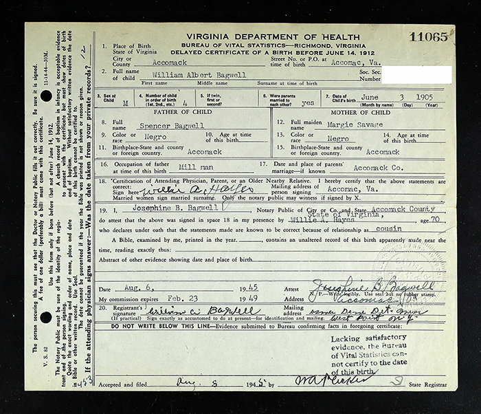 - [S6908] Daniel Bagwell, Certificate of Birth - Commonwealth of Virginia File No: 24261; Registration District No. 4-B, Registed No. 59, County of: Accomack, Magisterial District of Lee (June 10, 1917).