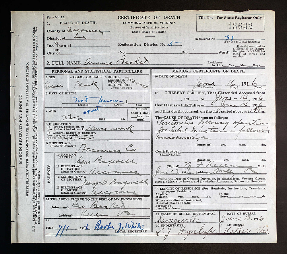 Annie Bagwell was born in February 1894 in Virginia. She was the daughter of Samuel H. Bagwell and Margaret Sarah Walker. As of 30 October 1910,her married name was Beckett. Annie Bagwell married George Thomas Beckett on 30 October 1910 at Savageville, Accomack County, Virginia. Annie Bagwell died on 16 June 1916 in Accomack County, Virginia, at age 22. She was buried on 18 June 1916 at Savageville, Accomack County, Virginia.