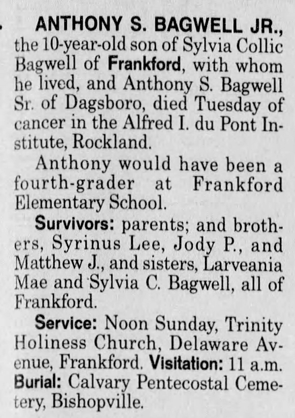 Anthony S. Bagwell Jr. was born circa 1986. He was the son of Anthony S. Bagwell Sr. and Sylvia Collic. Anthony S. Bagwell Jr. died on 9 July 1996 in Alfred I.du Pont Institute, Rockland, Dealware. He was buried on 14 July 1996 at Calvary Pentecostal Cemetery, Frankford, Delaware.