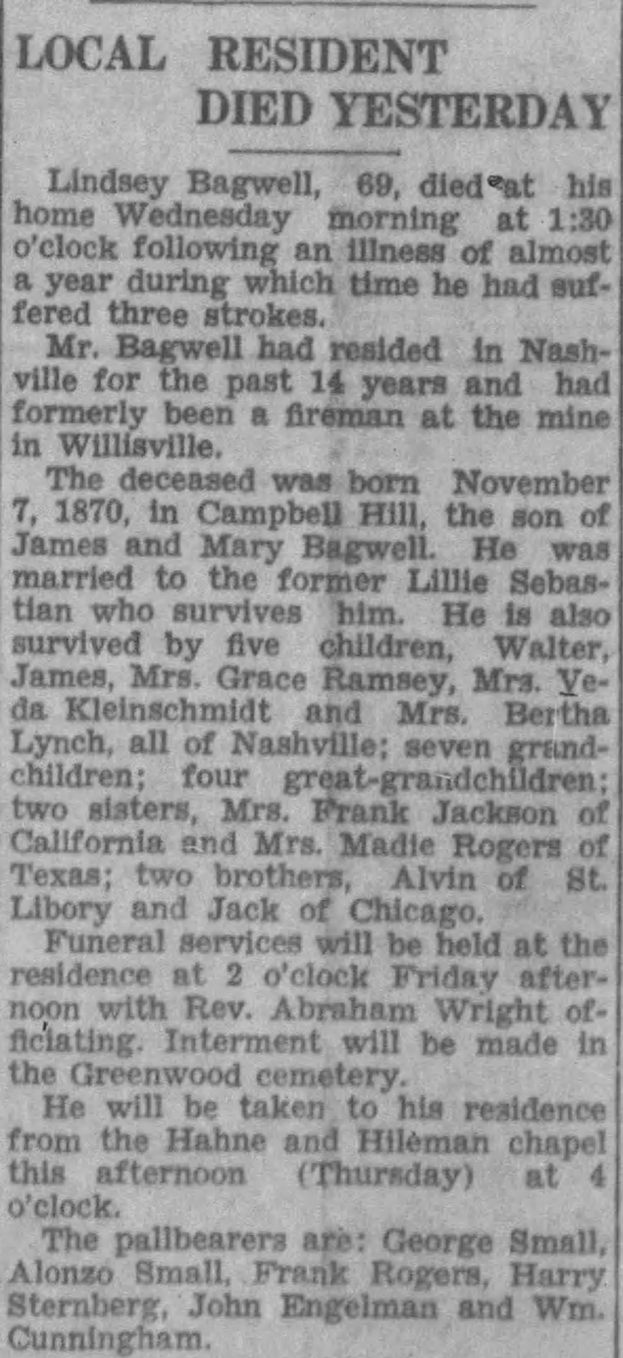 Lindsay E. Bagwell was born on 7 November 1870 in Campbell Hill, Jackson County, Illinois.1 He was the son of James Henry Bagwell and Mary Jane Brown.1,2 Lindsay E. Bagwell married Lillie J. Sebastian on 18 January 1893 at Jackson County, Illinois. Lindsay E. Bagwell died on 17 April 1940 in Nashville, Washington County, Illinois, at age 69. He was buried on 19 April 1940 at Greenwood Cemetery, Nashville, Illinois.