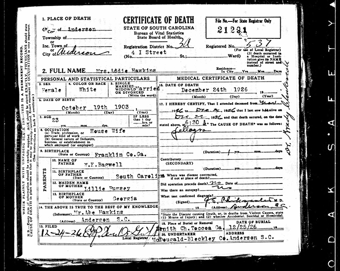 - [S6991] Addie Hawkins, Certificate of Death, State of South Carolina: Addie Hawkins.