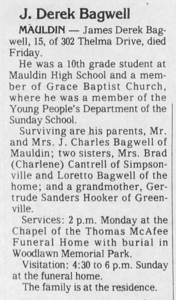 James Derek Bagwell was born on 14 February 1969.1 He was the son of James Charles Bagwell and Mary Elizabeth Hooker. James Derek Bagwell died on 7 September 1984 at age 15.1 He was buried at Woodlawn Memorial Park, Greenville, Greenville County, South Carolina.1