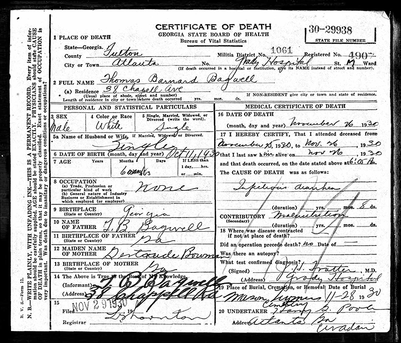 - [S6990] Thomas Barnard Bagwell, Certificate of Death, State of Georgia: Thomas Barnard Bagwell.