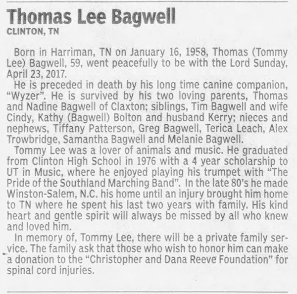 Thomas Lee Bagwell was born on 16 January 1958 in Harriman, Roane County, Tennessee. He was the son of Thomas Dean Bagwell and Nadine Jewel Branham. Thomas Lee Bagwell died on 23 April 2017 in Harriman, Roane County, Tennessee, at age 59.