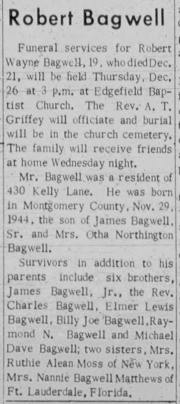 - [S7093] Robert Wayne Bagwell Grave Stone, Find a Grave, www.findagrave.com, https://www.findagrave.com/memorial/240085090