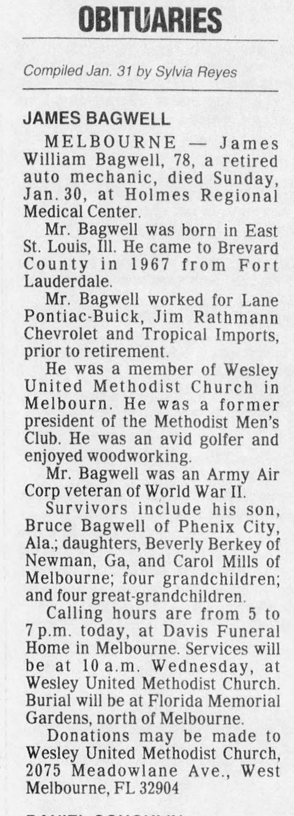 James William Bagwell was born on 27 July 1921 in East St. Louis, Illinois.2 He was the son of Albon Leslie Bagwell and Amy Jane Downen.1 James William Bagwell married Inez Newton in 1942 at Duval County, Florida.1 James William Bagwell died on 30 January 2000 at age 78.2 He was buried at Florida Memorial Gardens, Rockledge, Brevard County, Florida.2