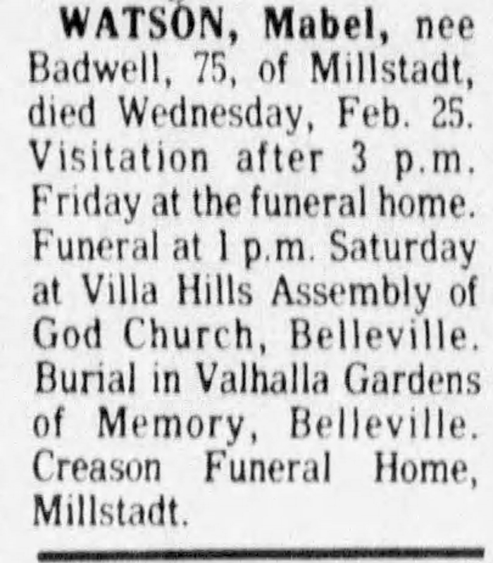 Mabel Irene Bagwill was born on 23 February 1906 in St. Clair County, Illinois.1 She was the daughter of Albon Leslie Bagwell and Amy Jane Downen.1 As of before 1924,her married name was Watson.1 Mabel Irene Bagwill married August M. Watson before 1924.1 Mabel Irene Bagwill died on 25 February 1981 at age 75.1 She was buried at Valhalla Gardens of Memory and Mausoleum, Belleville, St. Clair County, Illinois.