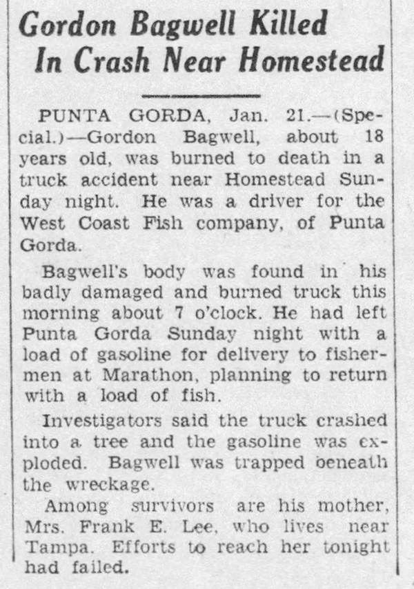 Gordon L. Bagwell was born circa 1917 in Florida. He was the son of Zachariah Taylor Bagwell and Evelyn (?) Gordon L. Bagwell died on 21 January 1935 in Homestead, Florida, burned to death in a truck accident.