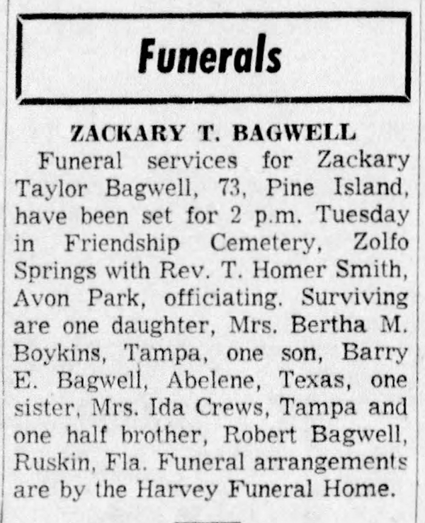 Zachariah Taylor Bagwell was born in August 1887 in Florida. He was the son of Berry E. Bagwell and Elizabeth Hollis. Zachariah Taylor Bagwell married Evelyn (?) before 1917. Zachariah Taylor Bagwell died on 16 June 1961 in Pine Island, Florida, at age 73. He was buried on 20 June 1961 at Friendship Cemetery, Zolfo Springs, Florida.