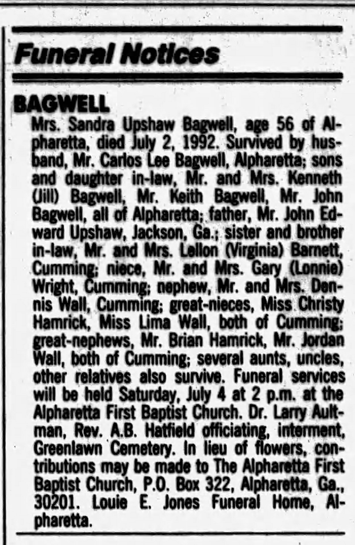 Sandra Sue Upshaw was born on 5 March 1936 in Georgia. As of 1962,her married name was Bagwell. She married Charles Lee Bagwell, son of Forrest Franklin Bagwell and Addie Massey, in 1962. Sandra Sue Upshaw died on 2 July 1992 in Alpharetta, Fulton County, Georgia, at age 56. She was buried on 4 July 1992 at Green Lawn Cemetery, Roswell, Fulton County, Georgia.