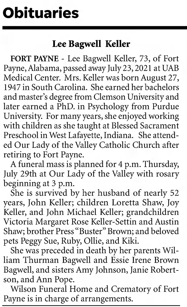 Lee Bagwell was born on 27 August 1947 in South Carolina. She was the daughter of William Thurman Bagwell and Essie Irene Anglin. As of circa 1969,her married name was Keller. Lee Bagwell married John Keller circa 1969. Lee Bagwell died on 23 July 2021 in Birmingham, Jefferson County, Alabama, at age 73. She was buried at Our Lady of the Valley Cemetery, Fort Payne, Alabama.