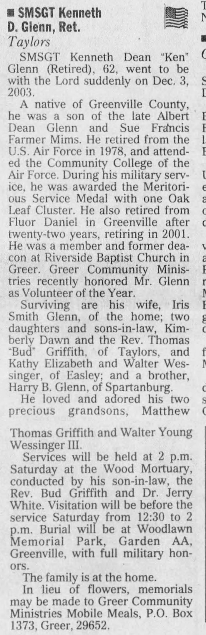 Kenneth D. Glenn was born circa 1941. He died on 3 December 2003. He was buried on 6 December 2003 at Woodlawn Memorial Park, Greenville, Greenville County, South Carolina.