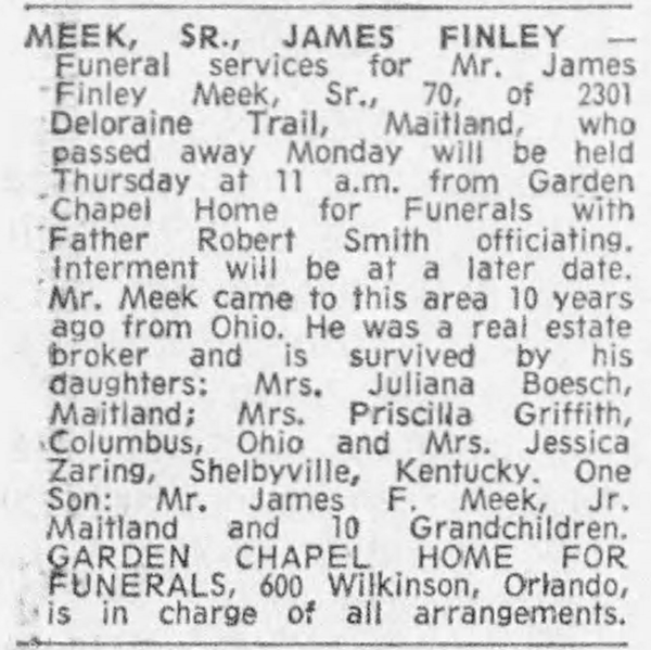 JAMES FINLEY MEEK JR., 39, 2301 Deloraine Trail, Maitland, died Sunday. Born in Cincinnati, Ohio, he moved to Maitland from Fort Lauderdale in 1960. He was a carpet installer and a Protestant. Survivors: sisters, Juliana Boesch, Maitland, Priscilla Feeney, Fairfield, Ohio, Jessica Zaring, Shelbyville, Ky. Wages Funeral Home, Stone Mountain, Ga.