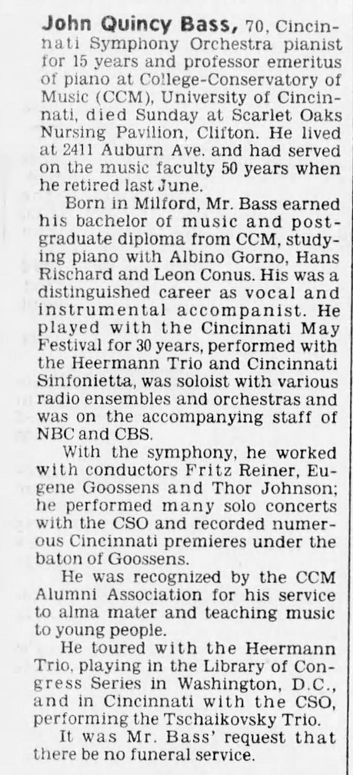 John Quincy Bass was born on 4 August 1908 in Milford, Ohio. He was the son of Dr. Samuel Quincy Bass and Edith Petzhold.1,2,3,4 John Quincy Bass appeared on the 1910 United States Federal Census for Miami Township, Clermont County, Ohio, enumerated on 23 April 1910.4 He lived in 1964 in Cincinnati, Hamilton County, Ohio.2 He died on 25 February 1979 at age 70.