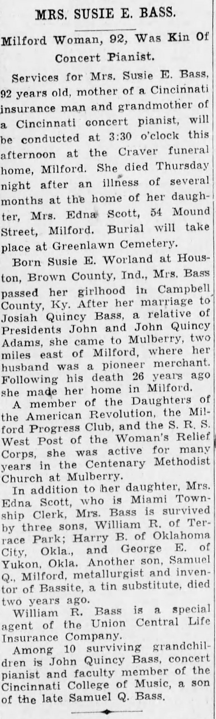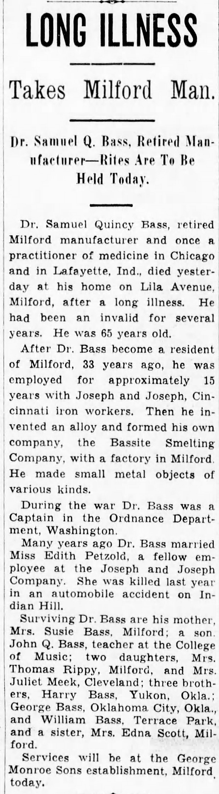 Dr. Samuel Quincy Bass was born in 1872 in Clermont County, Ohio.1 He was the son of Josiah Quincy Bass and Susan Eunice Warland.1,2 Dr. Samuel Quincy Bass appeared on the 1880 United States Federal Census for Miami Township, Clermont County, Ohio, enumerated on 7 June 1880.1 He married Edith Petzhold on 6 January 1903 at Hamilton County, Ohio.2,3 Dr. Samuel Quincy Bass and Edith Petzhold appeared on the 1910 United States Federal Census for Miami Township, Clermont County, Ohio, enumerated on 23 April 1910.3 Dr. Samuel Quincy Bass lived in 1937 in Milford, Hamilton County, Ohio.2 He died on 3 March 1938 in Milford, Clermont County, Ohio.2 He was buried on 4 March 1938 at Greenlawn Cemetery, Milford, Clermont County, Ohio.